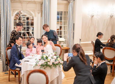 挙式と披露宴の間のアペリティフパーティーや披露宴でのテーブルラウンドなど、高砂以外でもゲストと何度も近くで話したり写真を撮る機会があったのも、アットホームな雰囲気になった理由かなと思います。