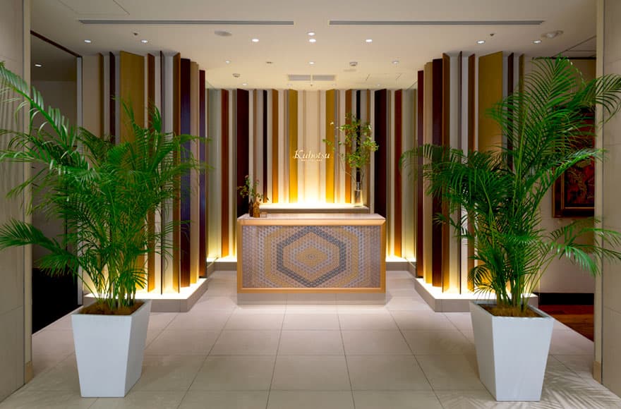 見る角度や光によって表情を変えるオリジナルの大川組子が皆様をお迎えします。