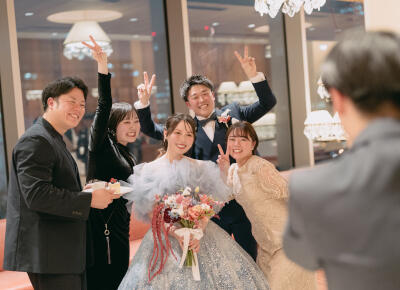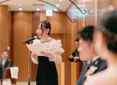 披露宴当日は頼れるスタッフさんの先導のおかげで披露宴はもちろんのこと、ゲストの皆さんとの歓談や写真撮影すべてがスムーズに進行していき無事に終えることができました。はじめはすごく緊張していましたが、サポートのおかげで楽しく過ごすことができました。近くにスタッフさんが笑顔でいてくださったのもとても安心できました。